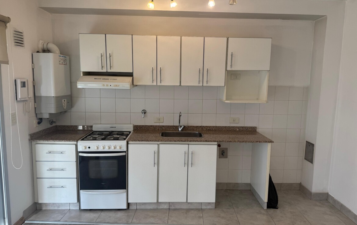Cocina integrada totalmente equipada con muebles bajo mesada y alacena, cajonera con guías metálicas y detalles de terminación con bordes de aluminio, bacha de acero inoxidable, grifería monocomando, mesada de granito color natural, artefacto de cocina de 4 hornallas con horno y parrilla, conexión para lavarropas.