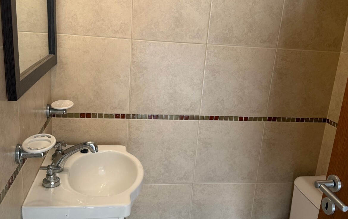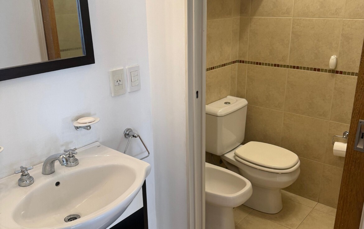 Baño compartimentado, revestimiento cerámico de piso a techo con guarda decorativa, sanitarios, grifería, accesorios, bañera, mampara y extractor de primera calidad.