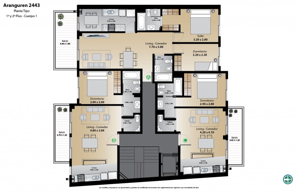 Departamento 2 ambientes, 45 m2 de superficie, al contrafrente, orientado al norte y balcón corrido con toldo y protección..